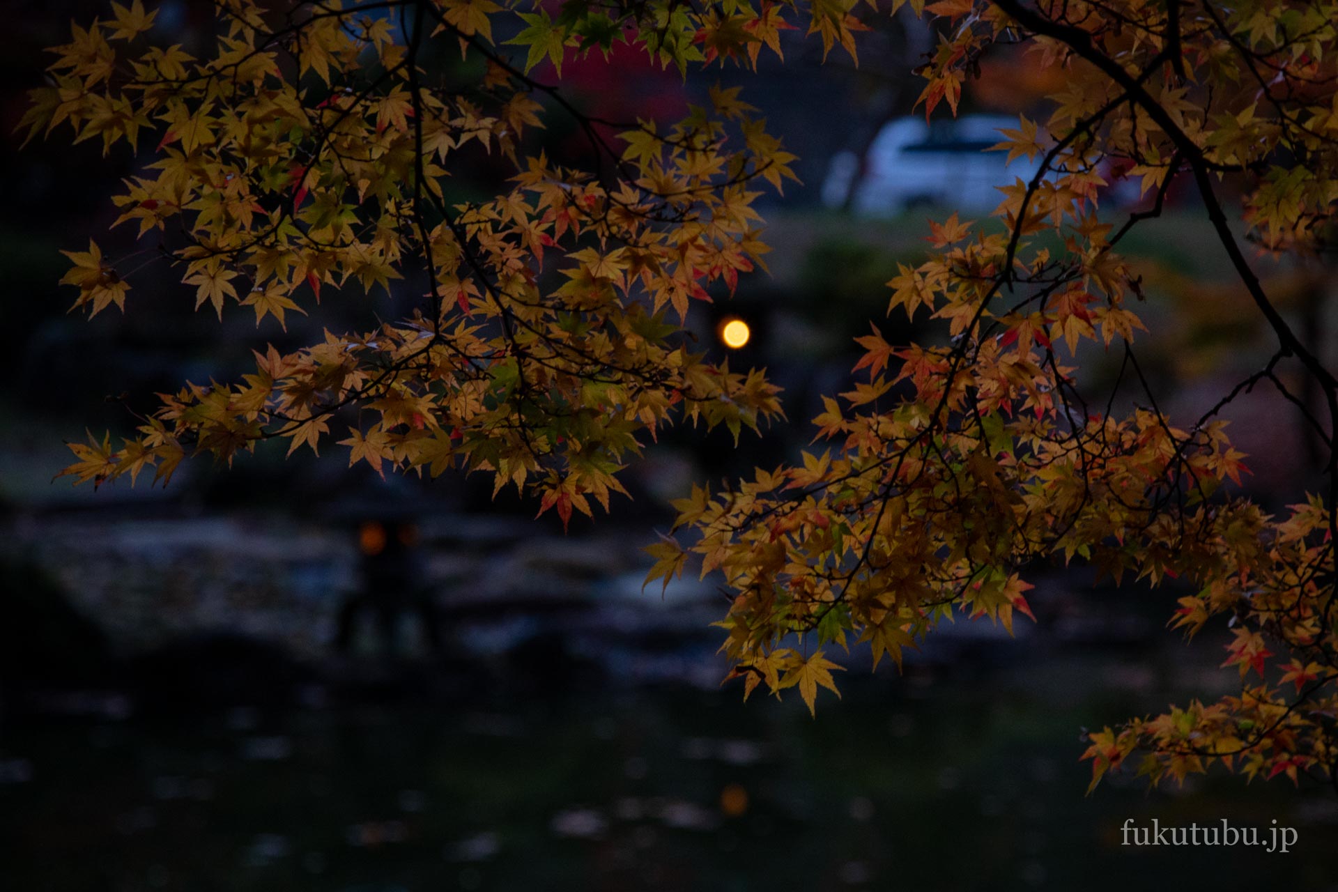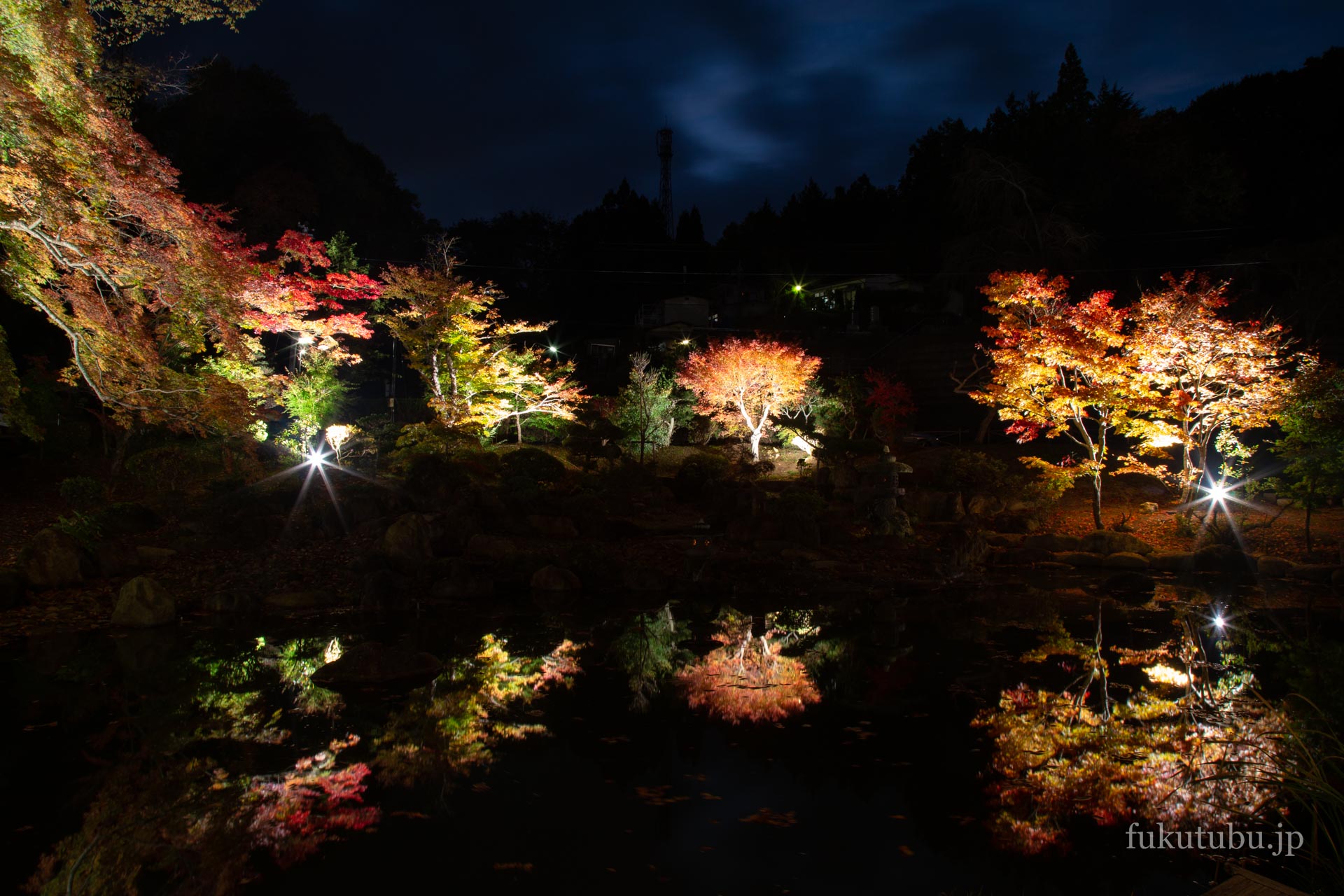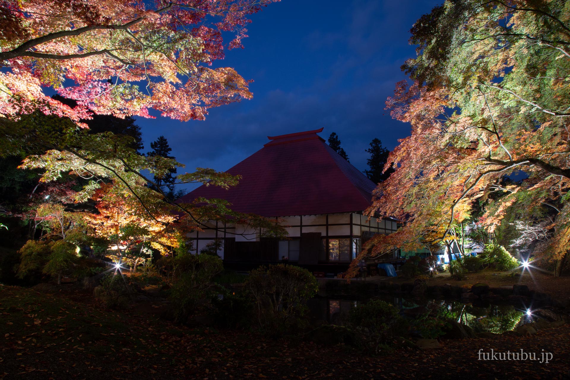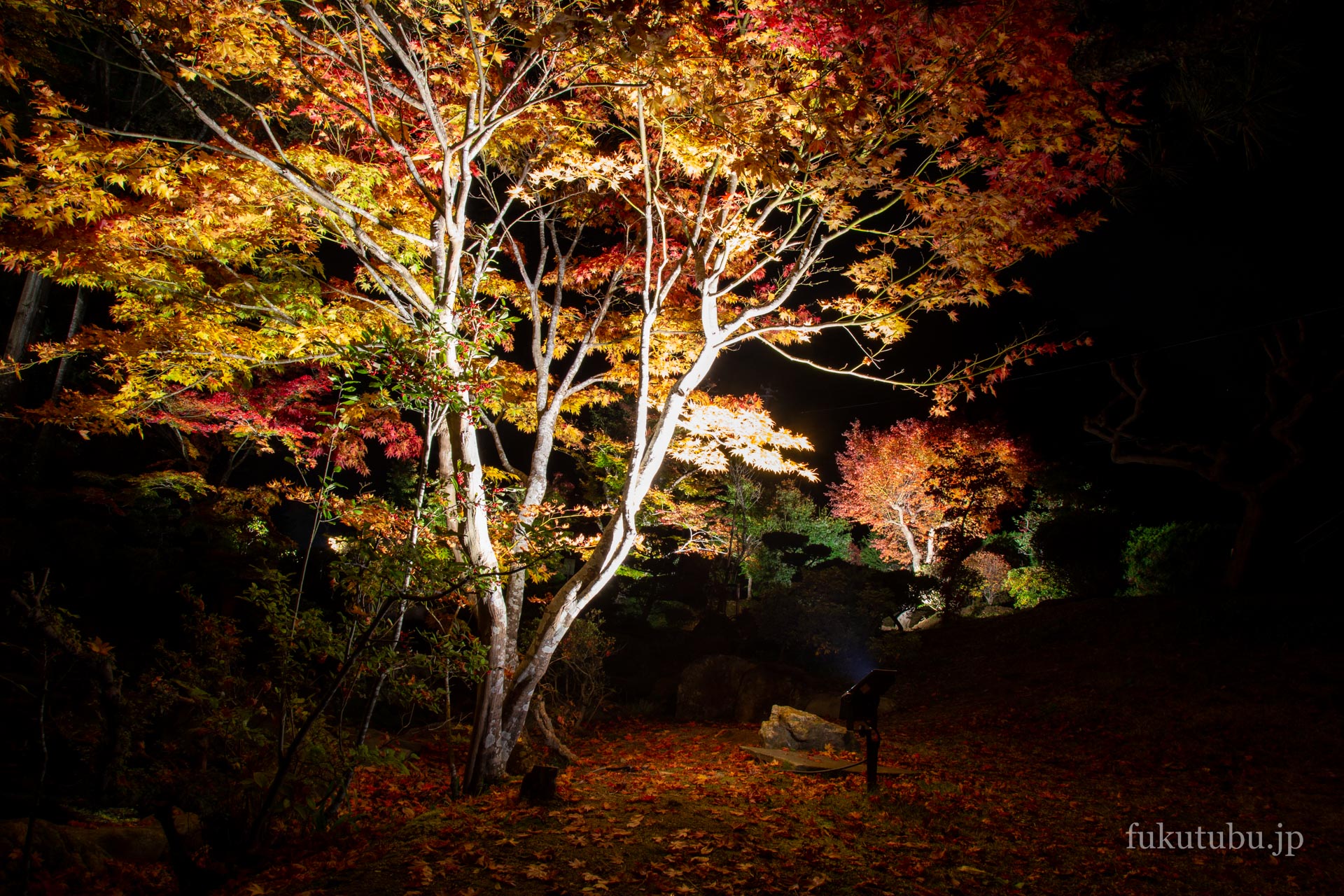 既に数名のお客様が点灯を待っており、慌てて三脚を取りに戻ってくると、本堂裏手の庭園に植えられた紅葉のライトアップが始まりました。